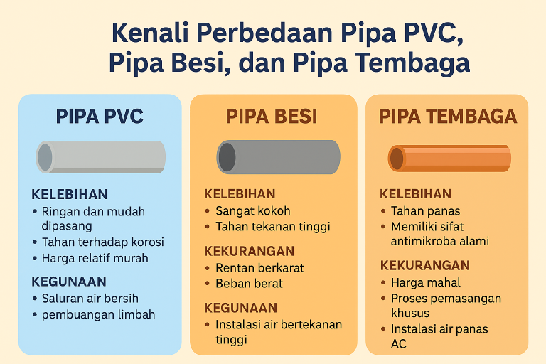 Tukang pipa ( 22/09/2025) Dalam sistem instalasi saluran air di rumah, pemilihan material pipa sangatlah penting. Setiap jenis pipa memiliki karakteristik, kelebihan, dan kekurangan masing-masing. Tiga material yang paling banyak digunakan adalah pipa PVC, pipa besi, dan pipa tembaga. Mengetahui perbedaannya akan membantu Anda menentukan pilihan terbaik sesuai kebutuhan rumah tangga.